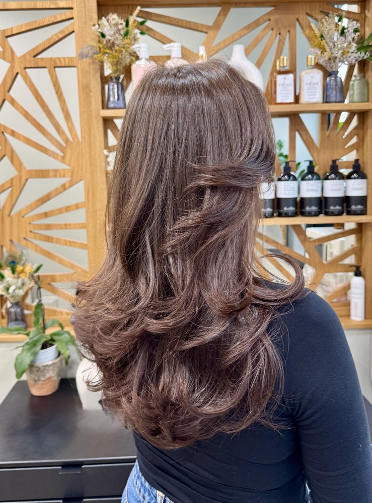 La prestation se termine par un coiffage qui révèle une couleur naturelle, des reflets équilibrés et une chevelure visiblement plus saine.